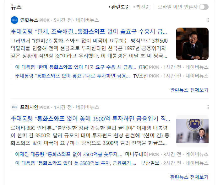 오늘의 통화스와프 관련 기사들의 이 대통령의 발언은 사실상 경고다. 관세 문제를 조속히 풀겠다는 메시지 뒤에는 통화스와프가 없는 상태에서 미국의 요구를 일방적으로 수용하면 한국 금융시장이 심각한 위기를 맞을 수 있다는 절박함이 숨어 있다.