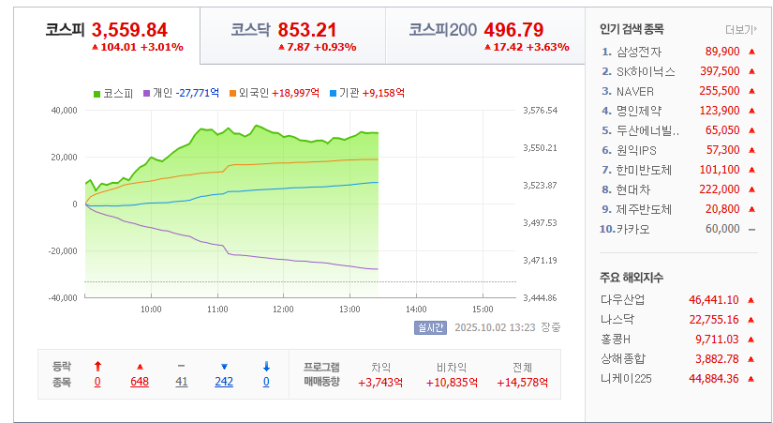 한국 증시가 다시 역사를 썼다. 목요일 코스피는 3% 이상 급등하며 사상 최고치를 갈아치웠다. 중심에는 단연 삼성전자와 SK하이닉스가 있었다. 전날 늦게 발표된 오픈AI와의 메모리칩 공급 파트너십은 시장의 기대감을 폭발시켰고, 두 종목은 각각 4%, 11% 이상 치솟으며 지수를 끌어올렸다.