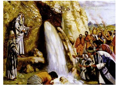 “모세가 그의 손을 들어 그의 지팡이로 반석을 두 번 치니 물이 많이 쏟아나므로 회중과 그들의 짐승이 마시니라.”